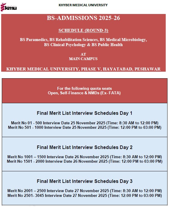 (KMU Institute of Paramedical Sciences, KMU Institute of Physical Medical and Rehabilitation, KMU Institute of Public Health & Social Sciences, KMU Institute of Pathology and Diagnostic Medicine, KMU Institute of Mental Health & Behavioral Sciences ) from the candidates who duly appeared in KMU-CAT Test 2025, for the session 2025-26,